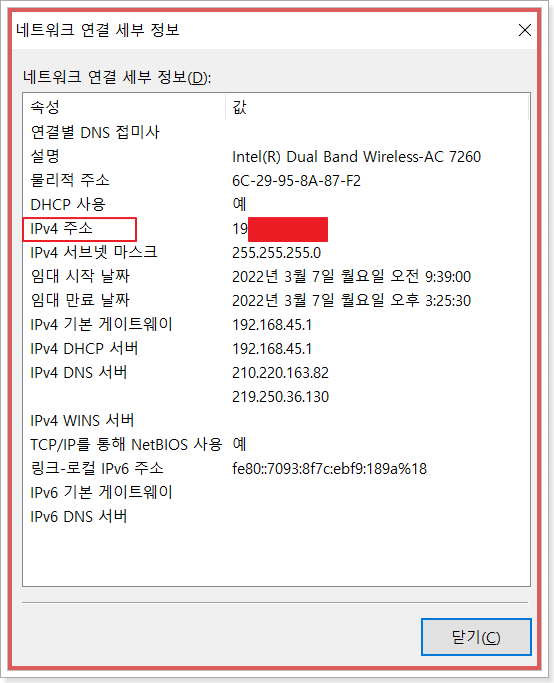 위와 같이 들어가면 PC의 사설IP주소를 확인하실 수 있습니다.