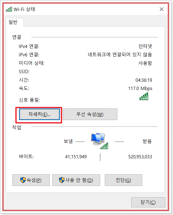 역시 네트워크 연결로 들어가서 wifi로 들어간 다음 이번에는 속성으로 들어갑니다.