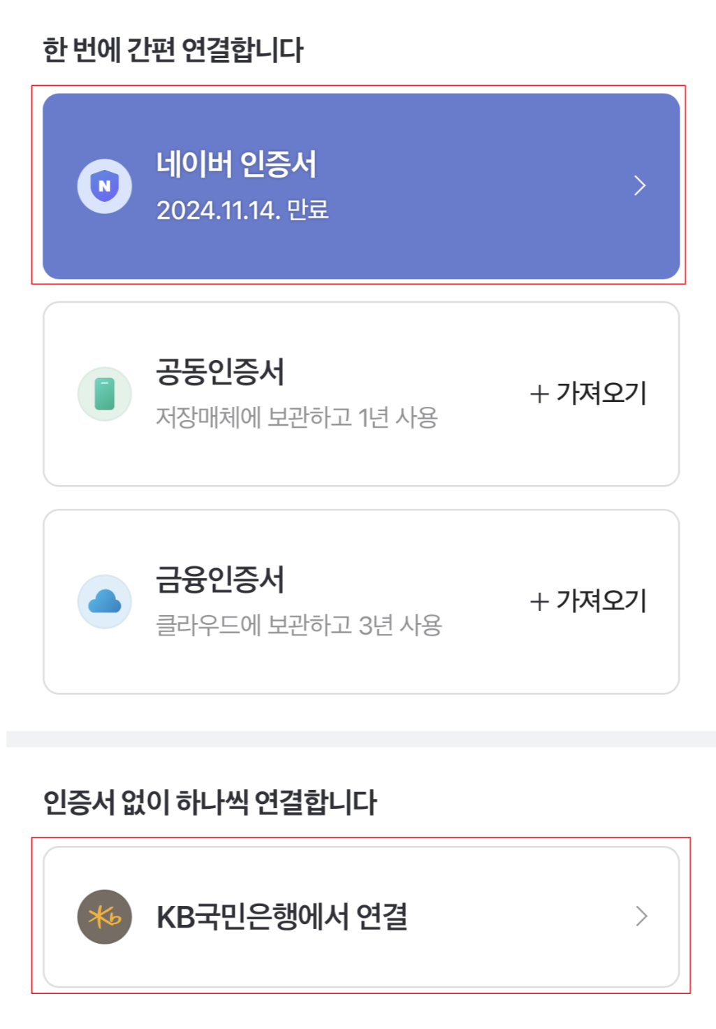 은행계좌를 연결할 때 공동인증서가 스마트폰에 있으신 분들은 공동인증서를 사용해서 연결하면 되지만 없으신 분들은 네이버 인증서를 통해서 비교적 간단하게 연결을 하실 수 있으니 이 방법을 추천드립니다.
