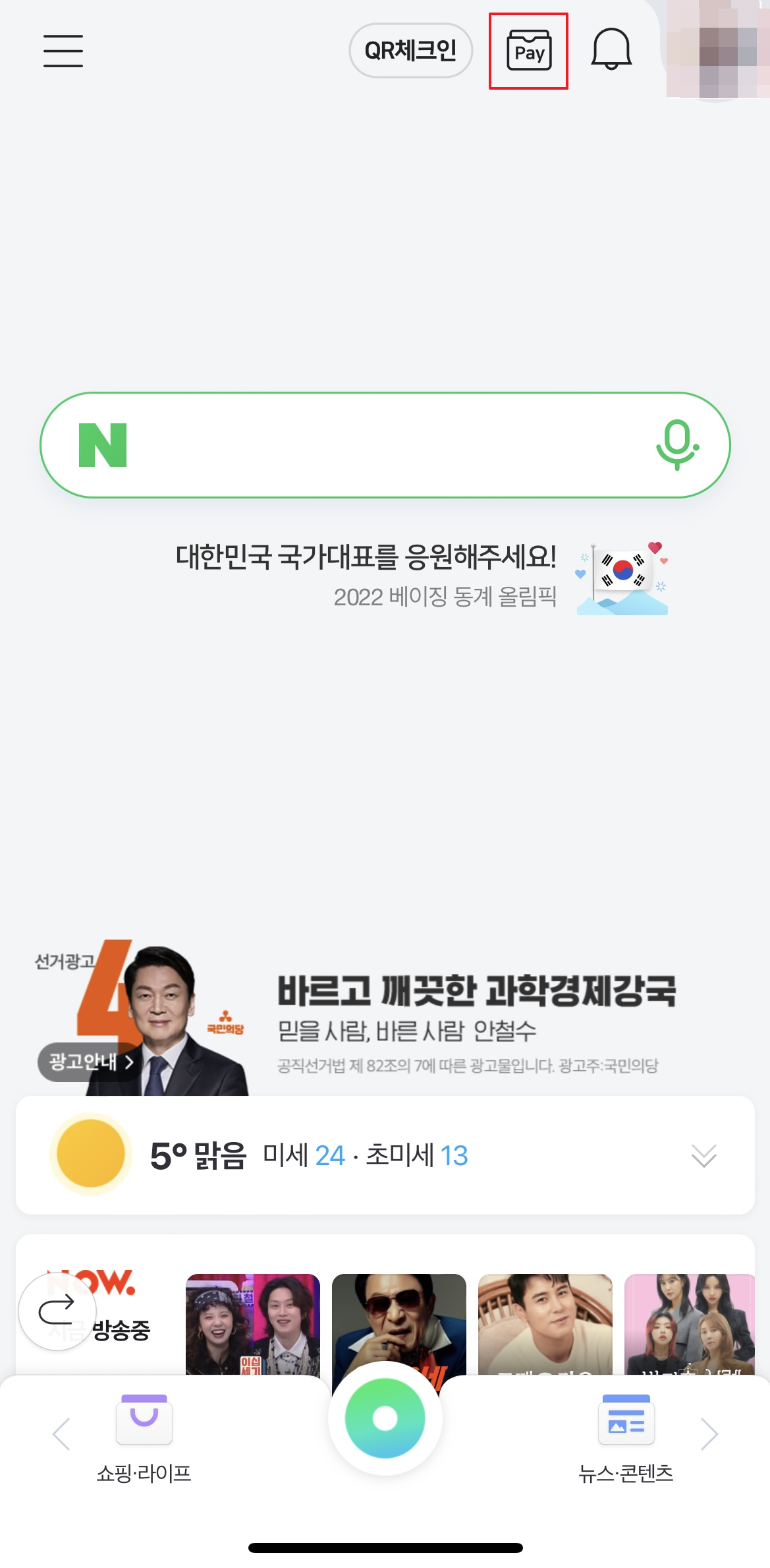 그리고 나서 QR체크인 옆에 Pay라고 적힌 것을 클릭을 하면 네이버페이 화면이 뜹니다.