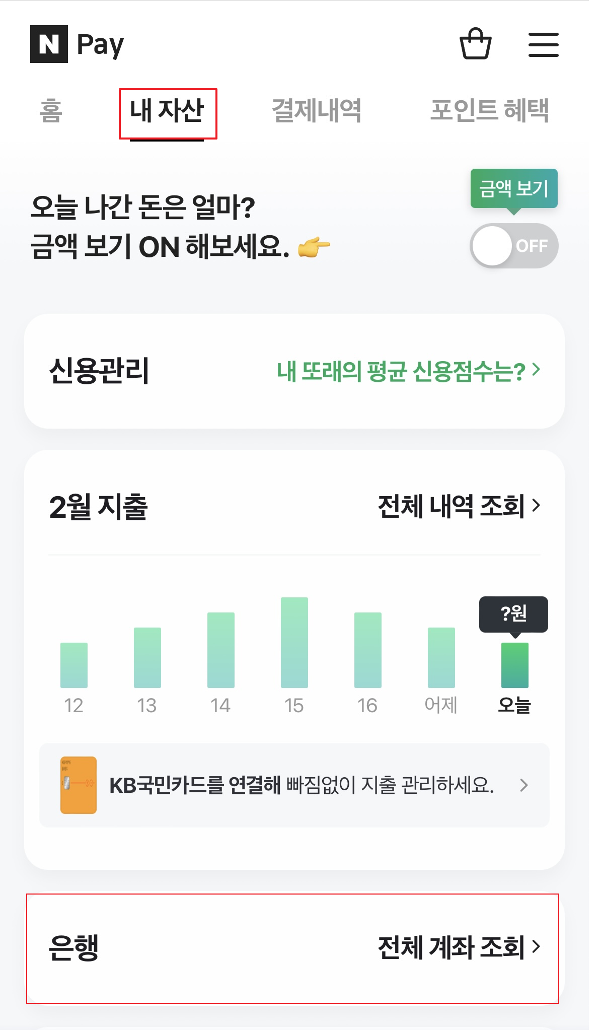 내 자산에서 맨 아래에 본인의 거래 은행 계좌번호를 연동하는 것이 있는데, 네이버 포인트에 돈을 이체시켜서 사용할 것이 아니라면 은행계좌를 연결해 놓는 것이 장기적으로 보았을 때 좋은 것 같습니다. 저는 이미 계좌를 연결해 놓았기 때문에 전체 계좌 조회로 뜨는데요. 아직 안 하신 분들은 '은행 연결하기'로 나옵니다.