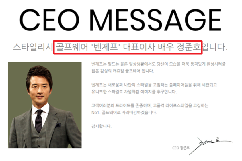연예인들의 부업은 이미 많은 사람들에게 알려져 있는 사실인데요. 이미 연예인 생활로도 적지 않은 수입을 벌어들이고 있는 그들이 부업을 하면서 월 3000만 원씩은 번다고 하는데요. 물론 사람마다 버는 액수는 다르겠지만 그 정도로 벌어들이는 수익이 많다고 볼 수 있겠습니다. 대표적으로 배우 정준호 씨가 있습니다. 배우로도 오랜 기간 인지도 있게 작품 활동을 하고 있는 그는 다양한 사업을 하고 있다고 하는데요. 그중 하나가 골프웨어 벤제프 CEO입니다.