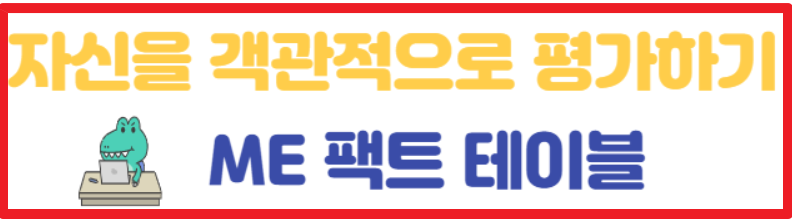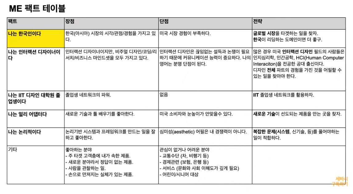 세바시에 출연을 해서 김은주 디자이너가 본인의 역량과 할 수 있는 일을 구체화시키고 싶을 때 본인이 쓰는 ME 팩트 테이블을 공개를 했습니다. 그야말로 팩트만을 정확하게 적는 것입니다.