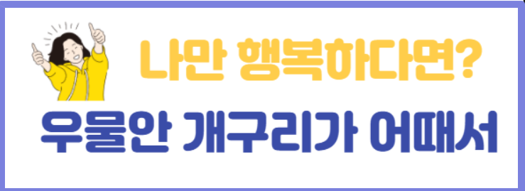 하지만 우물안 개구리가 우물 밖을 나가면 더 이상 개구리로서 살 수가 없다는 것입니다. 문제는 우물 안의 개구리가 문제가 아니라 우물 안에게 불행하게 사는 개구리가 문제라는 것이죠. 즉 내가 어디에 있는가는 중요하지 않다는 것입니다. 내가 있는 곳이 작든 크든 그것에 내 가치를 부여하는 것이 아니라 어디에 있든지 내가 행복하면 된다는 것이 핵심인 것이지요.
