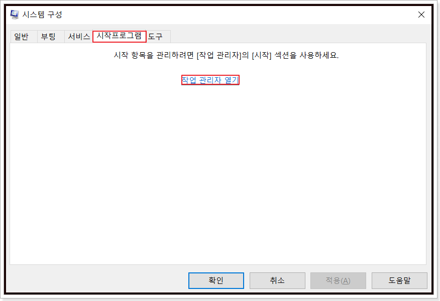 여기서 시작프로그램을 클릭을 하면 작업 관리자 열기라는 단어가 보이는데요. 이것을 클릭해줍니다. 그러면 아래와 같이 현재 윈도가 실행이 될 때 자동으로 실행이 되는 프로그램 목록이 보입니다.