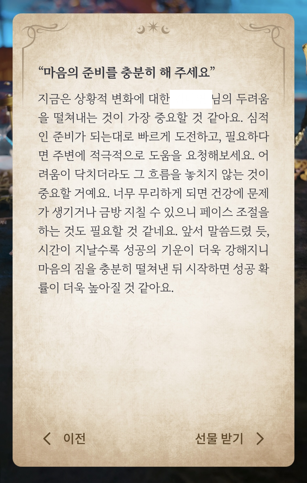 물론 이러한 타로점을 맹신할 필요는 없지만, 그래도 이렇게 좋은 이야기를 해주면 아무래도 영향을 받을수 밖에 없는 것 같아요. 지금 하고 있는 일을 더 열심히 할 동기부여가 되는 것 같기도 하고요. 앞으로 2개월간 무언가를 성취해 낼 수 있게 거침없이 도전을 해봐야겠습니다.