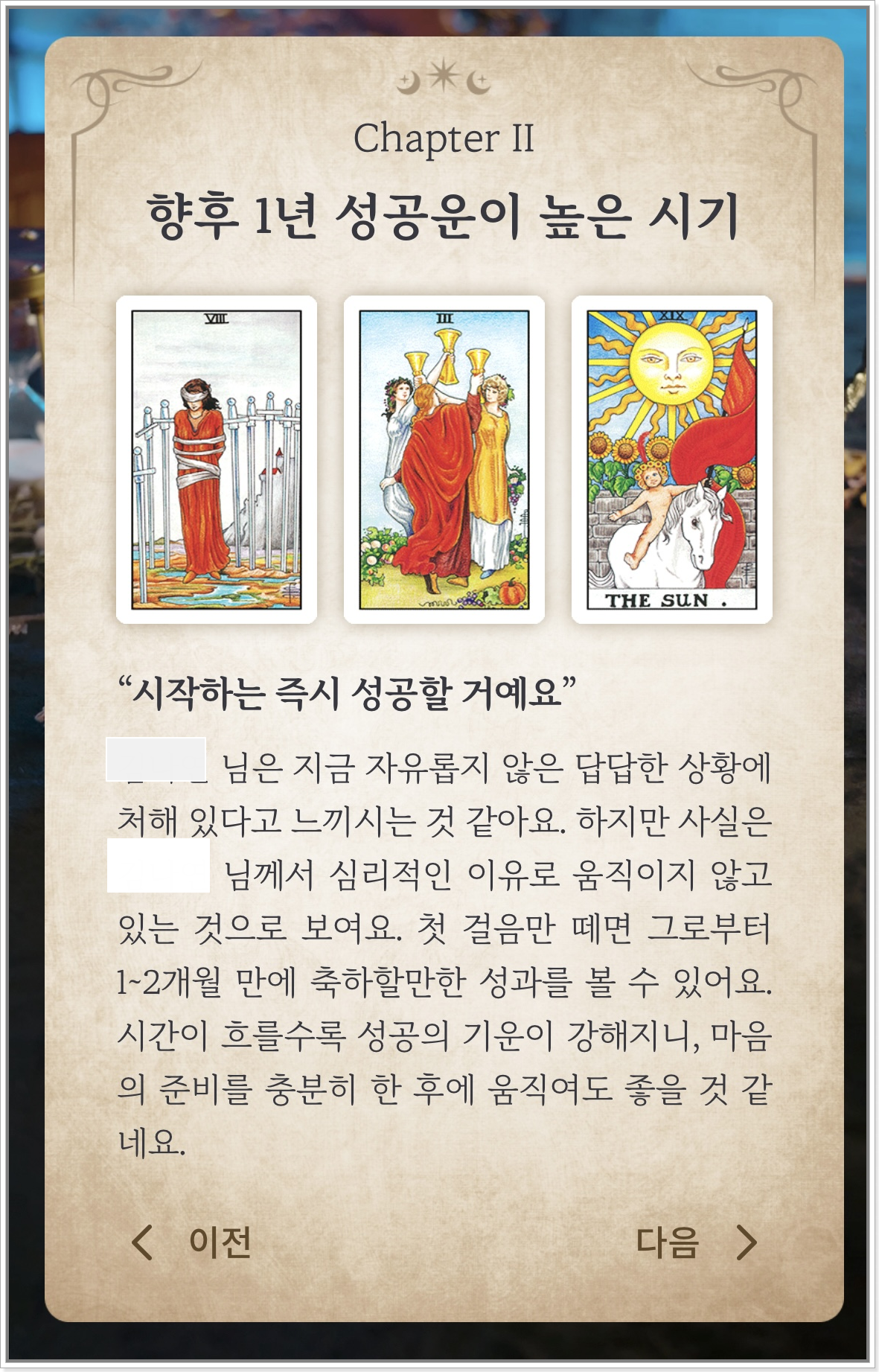 물론 이러한 타로점을 맹신할 필요는 없지만, 그래도 이렇게 좋은 이야기를 해주면 아무래도 영향을 받을수 밖에 없는 것 같아요. 지금 하고 있는 일을 더 열심히 할 동기부여가 되는 것 같기도 하고요. 앞으로 2개월간 무언가를 성취해 낼 수 있게 거침없이 도전을 해봐야겠습니다.