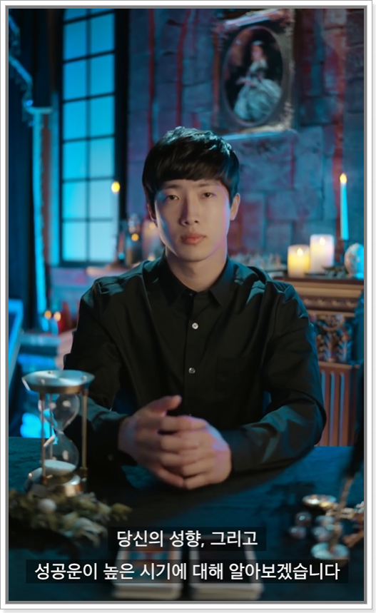 입장을 하면 타로점을 봐주시는 선생님이 등장을 합니다. 정말 타로집에 있는 것 같은 느낌을 가져다주는데요. 우리의 성향과 성공운이 높은 시기에 대해서 알아봐 주십니다.
