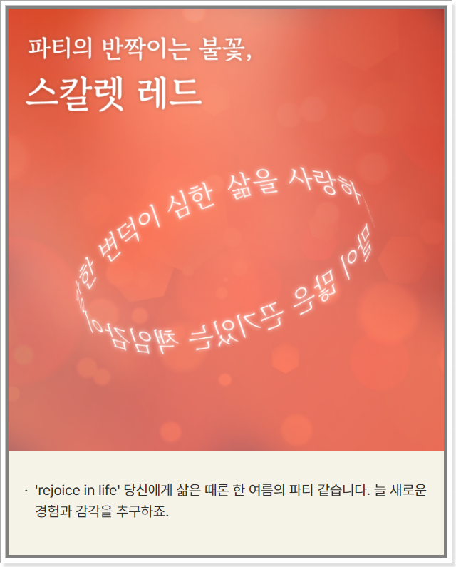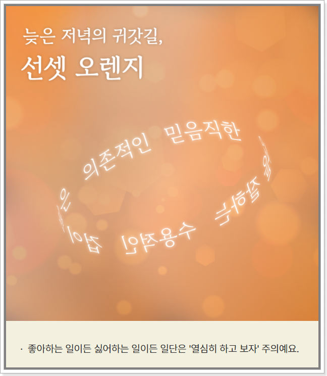 저는 선셋오렌지가 나왔네요. 좋아하는 일이든 싫어하는 일이든 일단은 열심히 하고 보자라는데, 맞는 것 같아요. MBTI와 어느 정도 일맥상통하는 것을 알 수가 있는 것 같습니다.