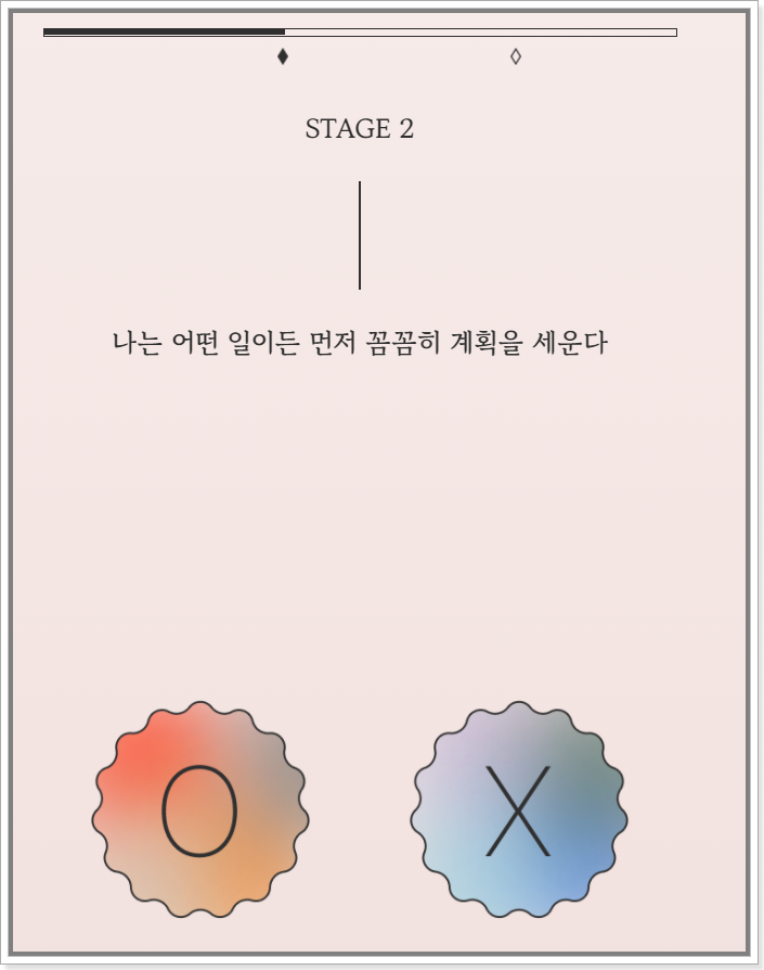 위와 같이 O, X 로 선택할 수 있는데요. MBTI 테스트에 비해서 엄청 간단하게 나와있고, 질문 자체도 간단,명료해서 명확하게 선택을 할 수 있게 만들어 놓았습니다.