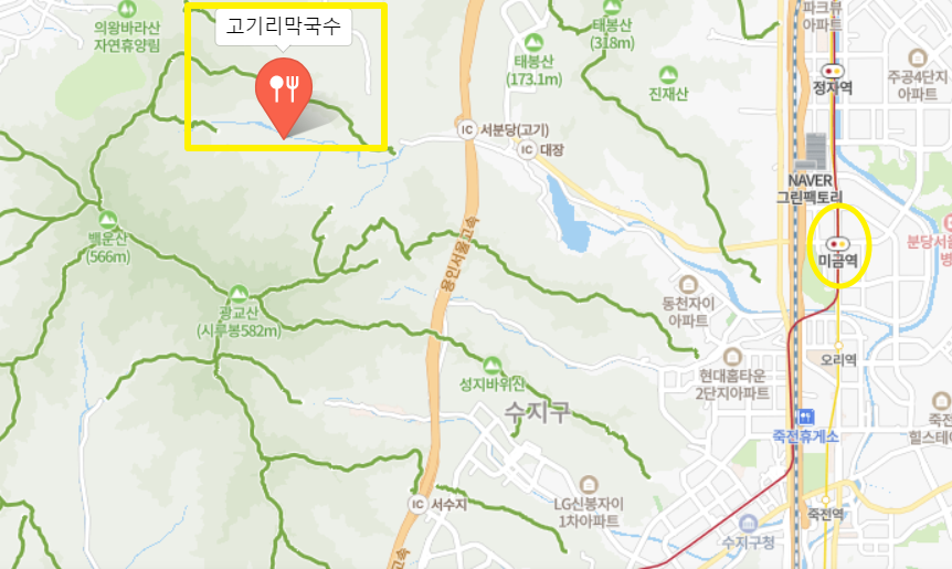 지도에서 아무리 찾아봐도 근방에 지하철역이나 버스 정류장을 찾아보기 힘들었고, 접근성으로 보았을 때도 굉장히 거리가 먼 곳에 위치해 있습니다. 그나마 가까운 지하철역은 신분당선 미금역이고, 고기리 막국수까지 대중교통을 이용할 경우 미금역 앞에서 20분에 한 대씩 오는 14번 마을버스를 타고 산길을 굽이굽이 넘어 무려 32개의 정류장을 거쳐야만 도착할 수 있다고 합니다. 과연 이러한 수고를 하면서까지 찾아가서 게다가 기본 2시간을 웨이팅을 해서 먹을 수 있다는 이곳의 인기 비결은 무엇일까요?