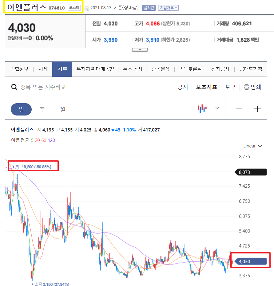 당시 장동민이 지인의 추천으로 투자를 했던 회사는 바로 '이엔플러스'였습니다. 이엔플러스는 탄소 복합소재 전문기업으로 알려져 있으며 전기자동차용 대용량 2차 전지, 그래핀 소재 적용 및 차세대 2차 전지 연구개발 등을 진행하고 있는 기업입니다. 최근에 들어 다시 급등을 하고 있으나 장동민이 매수할 당시 아마도 최고점이었을 것으로 예상이 됩니다. 현재는 그에 비해 반토막 정도가 나 있는 상태이네요.