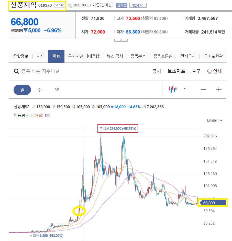 작년에 그가 본격적으로 주식 투자를 하면서 많은 수익을 맛보았던 종목들을 공개를 하였는데요. 가장 많은 거래가 일어났던 종목을 '신풍제약'입니다. '신풍제약'은 작년에 가장 핫했던 바이오 종목인데요. 그는 작년 2020년 7월 정도에 5만원에 담았다고 합니다. 한 때 20만원 이상까지 올라갔다가 떨어져서 현재는 66000원대에 거래가 되고 있는 종목입니다.