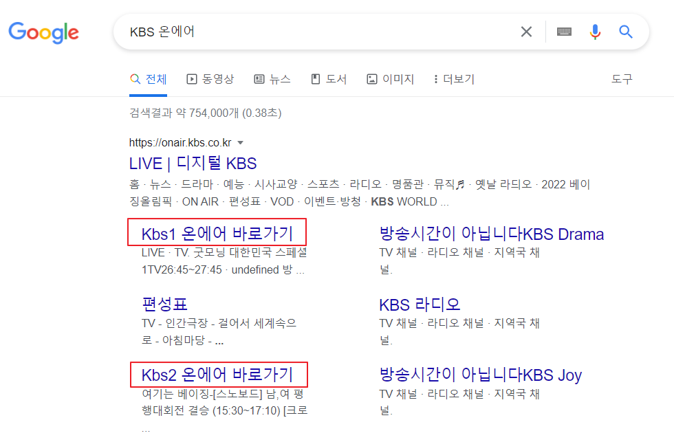 KBS1 온에어와 KBS2 온에어 바로가기가 나누어져 있으니, 원하시는 방송을 클릭하시면 바로 연결이 됩니다.